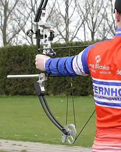 - O arco composto possui uma peculiaridade, pela qual o esforço feito pelo arqueiro atinge um pico quando o estiramento da corda chega a um valor de 65% a 80% do seu máximo (podendo chegar a 99% em alguns modelos), vindo depois disso a "ceder" sem contudo perder a tensão aplicada anteriormente na corda. Isso ocorre porque os eixos dos polias são montados na borda e não no seu centro. Quando a corda é puxada, as polias giram e forçam os membros, comprimindo-os. Depois que a polia gira completamente em seu eixo, uma menor quantidade de força deve ser aplicada à corda para manter os membros sob compressão, dando ao arqueiro um tempo maior para mirar com o arco tensionado.
