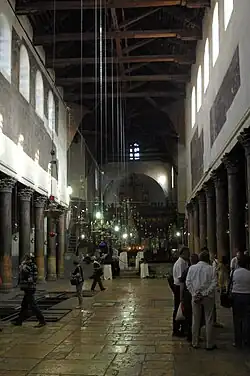 A Igreja da Natividade de Belém foi construída por volta de 333, embora tenha tido que ser reformada no século VI, depois de ter sido queimada e destruída durante a rebelião dos samaritanos em 529, liderados por Juliano ben Sabar. Tinha uma planta longitudinal que contava com um grande átrio, em frente à entrada, que servia de local de descanso aos peregrinos. A basílica era composta por cinco naves de planta quase quadrada (28 x 29 metros) e, centrada na parte inferior, existia uma abertura octogonal, revestida a madeira e rodeada por uma grelha, onde se avistava o local do nascimento de Jesus.[30]