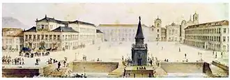 A chegada ao Brasil da Missão Francesa de 1816, foi um ponto crucial na difusão dos ideais neoclássicos a partir da capital, incentivada pela necessidade de se reorganizar a planta urbana do Rio após a chegada da família real portuguesa.[64] O arquiteto vindo com a Missão, Grandjean de Montigny, tornou-se professor de arquitetura da Escola Real de Ciências, Artes e Ofícios, fundada por D. João IV em 1816. Ainda durante o período colonial, Grandjean projetou a Praça do Comércio do Rio, construído entre 1819 e 1820, um edifício de planta centrada com uma grandiosa cúpula. Também projetou o edifício-sede da Escola, inaugurada apenas em 1826, considerado uma expressão pura do neoclássico francês em seu desenho, com fachada simétrica e um grande portal centralizado em ordem jônica, único elemento que chegou aos dias de hoje, instalado no Jardim Botânico do Rio de Janeiro. Apesar de haver construído pouco do que projetou, as aulas de arquitetura de Grandjean formaram vários arquitetos que tiveram destacado papel na afirmação do estilo neoclássico durante todo o período do Império.