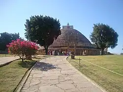 A stupa budista, um monumento em forma de cúpula, foi usada na Índia como um monumento comemorativo associado ao armazenamento de relíquias sagradas. A arquitetura stupa foi adotada no sudeste e leste da Ásia, onde se tornou proeminente como um monumento budista usado para consagrar relíquias sagradas. Os trilhos de proteção - consistindo de postes, barras transversais e uma cobertura - tornaram-se um recurso de segurança em torno de uma estupa. Os templos - construídos em planos elípticos, circulares, quadriláteros ou absidais - foram construídos com tijolo e madeira. Os arcos do portal indiano, o torana , chegaram ao leste da Ásia com a disseminação do budismo. Alguns estudiosos sustentam que o torii deriva dos portões torana no local histórico budista de Sanchi (século III aC - século XI dC). [7]