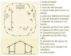 A casa tem de trinta a quarenta metros de extensão, até dez metros de altura e abriga cerca de 30 pessoas. Sua estrutura é composta por uma dois ou mais grandes pilares que apoiam a cumeeira, vários pilaretes nas extremidades, que suportam e seguram a dupla armadura (interna e externa), feita de ripas madeira e bambu amarradas entre si; enquanto que o revestimento é feito com sapê ou folhas de palmeira.[carece de fontes]