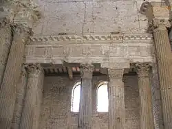A arquitrave síria, é constituída por três partes, com a do meio encurvada como uma arquivolta.[4]