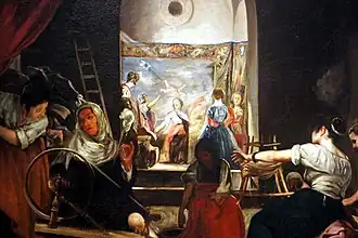 Velázquez divide a obra em planos, à maneira daquelas imagens medievais cujos grupos se «lêem» numa dada sequência, como se fossem páginas de um livro. Consegue que a nossa vista passe da fiandeira iluminada da direita à da esquerda, para saltar por cima da que se agacha, na penumbra, até à cena do fundo. Aqui, uma das mulheres está virada para o espectador como se se surpreendesse da nossa invasão da cena. Colocar a mensagem em segundo plano é um jogo típico do Barroco.