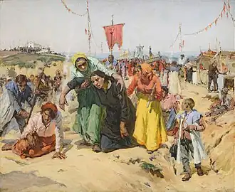 Na imagem destaca-se a mulher de negro, quase a cair, e ao seu lado a outra mulher de rastos, extenuadas de uma longa caminhada de joelhos sendo amparadas pela sua gente que as ajuda a recompor da auto-flagelação.[1]