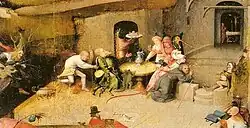 Para além das fontes literárias, a composição do painel guarda semelhanças com os esquemas cenográficos do teatro religioso medieval, especialmente na analogia entre o lugar onde acontece a cena principal e os palcos erguidos para representar os mistérios nas praças das cidades desse período.[5] É possível ainda compilar uma série de referências aos monstros das miniaturas medievais, às ilustrações astrológicas de provérbios flamengos e às procissões e dramas sacros populares.[2]