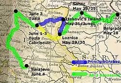 Princip, Grabež e Čabrinović deixaram Belgrado num barco em 28 de maio, viajando ao longo do rio Sava até Šabac, onde entregaram o pequeno cartão ao capitão Popović, da polícia de fronteira sérvia. Popović, por sua vez, forneceu-lhes uma carta para ser entregue ao capitão sérvio Prvanović e preencheu um formulário com os nomes de três funcionários aduaneiros cujas identidades eles poderiam assumir para receber passagens de trem com desconto na viagem para Loznica, uma pequena cidade da fronteira.[43][44]