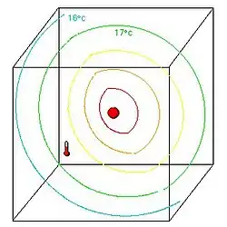 A fonte está presa. Ao tempo , faz 15°C em toda a peça. A fonte de calor activa-se, e é observada na peça.