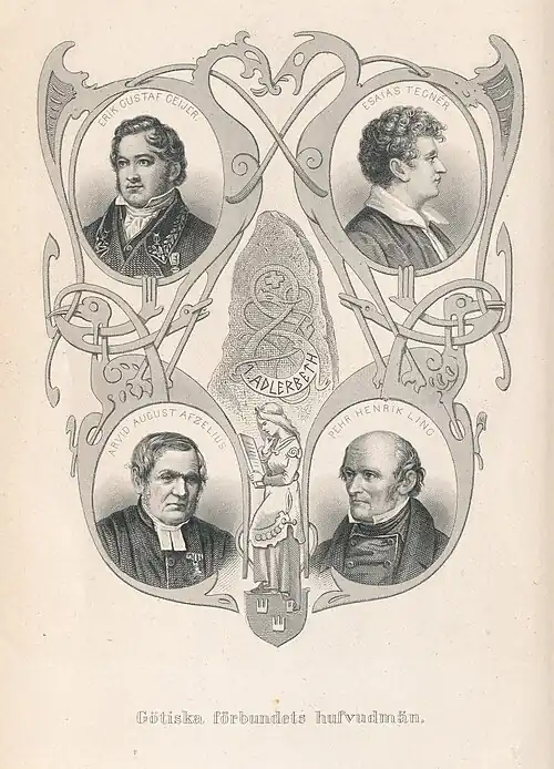 - ↑ «Götiska förbundet» (em sueco). Projekt Runeberg - Nordisk familjebok. Consultado em 21 de dezembro de 2016