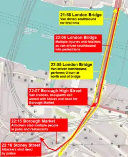 Por volta das 21h58h BST (UTC+1),[6] uma van branca veio pela Ponte de Londres (pelo norte) e subiu na calçada e começou a atropelar vários pedestres.[7][8] Após o carro bater perto de Barrowboy e do pub Banker na rua Borough,[9] os três homens dentro da van saíram do veículo utilizando cintos explosivos falsos, e correram até a rua Stoney, próximo ao mercado Borough, onde esfaquearam quatro pessoas no pub Borough Bistro.[10] O ataque com as facas aconteceu logo após os atropelamentos na ponte.[11] Alguns dos fregueses dentro do pub tentaram se defender, jogando garrafas, cadeiras e outros itens nos agressores.[12]