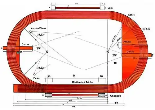 Medidas oficiais de uma pista oficial de atletismo.