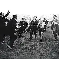 O marco da prova foi o incidente ocorrido na a parte final. O italiano Dorando Pietri teve enormes dificuldades durante o percurso e chegou a correr certos trechos na contra-mão, porém com mostras de esforço, conseguiu ser o primeiro atleta a entrar no estádio White City, ponto final da prova. Perto de cruzar a linha de chegada, dois oficiais perceberam o enorme esforço com que Pietri se encontrava e ajudaram a completar os últimos metros segurando em seu braço. Após cruzar a linha de chegada, Pietri foi desclassificado e a medalha de ouro ficou com o segundo corredor a cruzar a linha de chegada, o estadunidense Johnny Hayes.