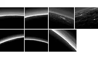A New Horizons descobriu na atmosfera de Plutão uma névoa multi-camadas que abrange a totalidade do planeta-anão e atinge altitudes acima de 200 km. As melhores imagens mostram aproximadamente 20 camadas de neblina. A extensão horizontal das camadas não é inferior a 1.000 km; enquanto que a distância vertical entre elas é de cerca de 10 km.[10]