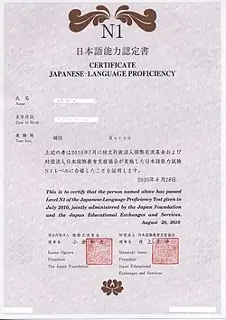 | Certificado de Proficiência obtido por passar no Nível N1 em 2010. | |
