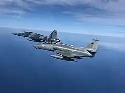 - VF-1 ("Falcão"):[183] o 1.º Esquadrão de Aviões de Interceptação e Ataque, criado em 2 de outubro de 1998, é responsável pelos jatos Douglas A-4 Skyhawk.[148] A dotação original era de 23 aviões nos modelos A4-KU (monoposto) e TA-4KU (biposto), respectivamente designados AF-1 e AF-1A no Brasil.[201] Após o programa de modernização de 2010–2022,[160] só restaram seis aviões, redesignados AF-1B (monoposto) e AF-1C (biposto).[202]