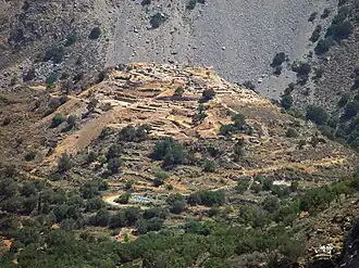 Durante as escavações levadas a cabo pelo Projeto Azoria forma descobertos vestígios de uma cidade grega do Período Arcaico fundada c. 600 a.C., que sucedeu a um longo período de ocupação entre a Idade do Ferro primitiva ou Idade das Trevas grega (1200–700 a.C.) e o Período Arcaico primitivo ( ou Período Orientalizante). A cidade foi destruída por um incêndio no século V a.C., tendo sido reocupada numa escala limitada ca. 200 a.C. — possivelmente uma só torre no cume da acrópole meridional.