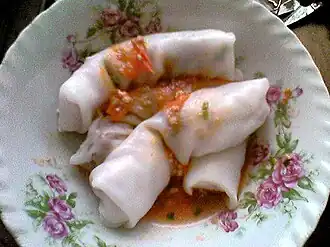 O prato cantonense coeng4 fan2 (肠粉; pinyin: chángfěn) é bastante semelhante, podendo o seu nome ser traduzido como crepe de arroz cozido a vapor.