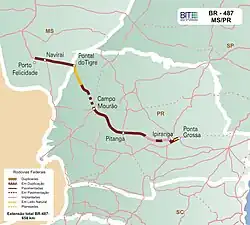 A BR-487 liga Naviraí, em Mato Grosso do Sul à Ipiranga, no Paraná. Seu trecho é bastante precário, sendo que aproximadamente 80% está no estado paranaense. Conhecida como Rodovia Boiadeira, foi muito usada para o transporte de gado. Grande parte do seu trecho é não-pavimentado, o que ocasiona transtornos à população que vive às suas margens, alternando poeira em períodos de seca e lama no período chuvoso. No Paraná é também chamada, pelo Governo do Estado, de PRT-487 em alguns trechos que estão sob seus cuidados.[1][2]