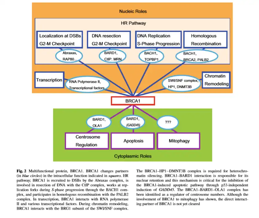 A proteína BRCA1 apresenta diversas funções no organismo. O principal motivo dessa diversidade deve-se ao fato de que BRCA1 possui capacidade de interagir com inúmeros tipos de proteínas, o que permite a formação de diferentes complexos proteicos.[10][15]