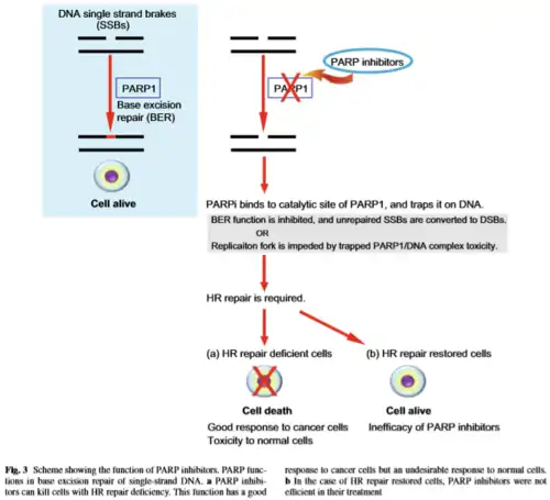 Uso de inibidor de PARP1 (enzyme poly (ADP)-ribose polymerase 1) para o tratamento de cânceres de mama e ovário associados a mutações em BRCA1/2. Nele o reparo de danos de fita simples, exercido por PARP1 por meio do mecanismo de excisão de base (BER - base excision repair) é inibido de modo a induzir o reparo por recombinação homóloga, a qual nas células com BRCA1, BRCA2 ou P53 não funcionais há persistência do dano e indução da morte celular.[13]