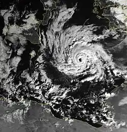 Em raras ocasiões, os sistemas tropicais que podem atingir a intensidade dos furacões ocorrem sobre o Mar Mediterrâneo. Tal fenomêno é chamado de ciclone tropical Mediterrânico ("Medicane"). Embora as dimensões geográficas do mar tropical e do Mar Mediterrâneo sejam claramente diferentes, os mecanismos precursores destas perturbações, baseados no desequilíbrio termodinâmico ar-mar, são semelhantes.[20] Suas origens são tipicamente não-tropical, e desenvolvem-se inicialmente sob forte ciclones de núcleo frio, ao longo águas abertas, semelhante à de ciclones subtropicais ou ciclones tropicais anómala no oceano Atlântico, como o Karl (1980), Vince (2005), Gracie (2009), Chris (2012), ou Ophelia (2017).[21] Temperaturas da superfície do mar no final de agosto e início de setembro são bastante elevados ao longo da bacia (24/28 °C ou 75/82 °F), embora a pesquisa indica que a temperatura da água de 20 °C (68 °F) são, normalmente, necessárias para desenvolvimento.[22]