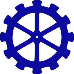 A engrenagem simboliza os trabalhadores.[7] A roda dentada ou engrenagem é o nome dado ao objeto geralmente circular ou cilíndrico, cujas extremidades estão cortadas em seções, em forma de "dentes", e são projetadas com a finalidade de compor um sistema que produz movimento. A tradição atribui a criação da roda dentada a Arquimedes de Siracusa (287 a.C. – 212 a.C.). Um dos tipos mais primitivos de engrenagens que se tem notícia é uma roda com cavilhas de madeira.[8] A engrenagem também representa o bom funcionamento interno de um dispositivo, uma peça que nem sempre está visível para os espectadores, mas que é essencial em um sistema. Ela também representa a ideia de movimento e constância.[9]