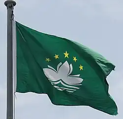 Esta bandeira representa a Região Administrativa Especial de Macau (RAEM) desde 1999, ano da transferência da soberania de Macau à República Popular da China (antes de 1999, Macau estava sob administração de Portugal).[1]