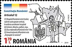 Mas a sua disposição actual foi adoptada oficialmente apenas em 27 de Dezembro de 1989. A bandeira anterior, do estado Socialista (1947-1989) continha o brasão de armas de então no centro da lista amarela. Durante a revolução de 1989 podiam ver-se muitas bandeiras com o emblema recortado, e o governo que se seguiu decidiu não adicionar um brasão à bandeira, tal como acontecia no pavilhão civil durante o Reino da Roménia (1881-1947).