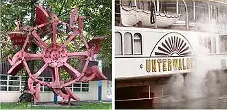 À esquerda, uma original roda de pás de um vapor, no lago de Lucerna. À direita, detalhe do funcionamento em um barco a vapor
