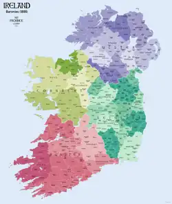 As baronias eram principalmente unidades cadastrais e não administrativas. Eles adquiriram modestas funções de tributação e gastos locais no século XIX, antes de serem substituídos pela Lei do Governo Local (Irlanda) de 1898. Os ajustes subsequentes dos limites dos condados significam que algumas baronias agora abrangem dois condados.[3]