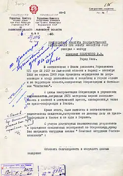 - ↑ "."[1].(ГДА СБУ фонд 1, опис 4 за 1964 рік, порядковий номер 3, том 5, аркуш 195 Розсекречено: 24/376 від 05.02.2008 р. - original sygnature of document).