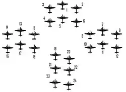 Há todos os motivos para acreditar que uma formação muito cerrada de 6 aeronaves Vickers Wellington emergirá de um ataque longo e pesado de caças inimigos com pouquíssimas ou nenhuma baixa para suas próprias aeronaves. Uma formação solta, no entanto, está sujeita a sofrer baixas muito pesadas nas mesmas condições.[59]