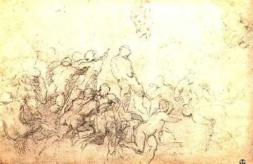 Michelangelo nunca completou este trabalho. Ele produziu, no entanto, uma ilustração da composição pretendida. O desenho foi copiado por vários artistas, sendo o exemplar mais notório ainda existente o de seu pupilo, Sangallo. Alguns dos desenhos preparatórios de Michelangelo também sobreviveram, além de gravuras de partes da cena, feitas por Marcantonio Raimondi. De acordo com o biógrafo Giorgio Vasari, o original foi deliberadamente destruído pelo rival de Michelangelo, Baccio Bandinelli, por invejar sua fama.