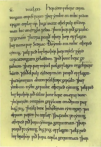 ![]() Uma página da Crônica Anglo-Saxônica descrevendo a Batalha de Englefield | |||