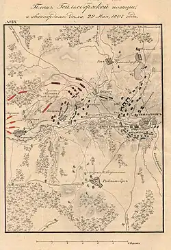 Benningsen tinha sido enganado em retirada por relatórios falsos dos números franceses.[6] Os russos, tendo voltado para Heilsberg, tinham alguma proteção contra trabalhos de campo substanciais.[7] Para invadir as fortificações, Napoleão teve que escolher entre um avanço imediato ou um movimento de flanco, ameaçando a base de suprimentos russa de Königsberg (agora Kaliningrado).[7] Ele escolheu o último, e os franceses assim se posicionaram de modo a cortar qualquer oportunidade para os russos obterem reforços.
