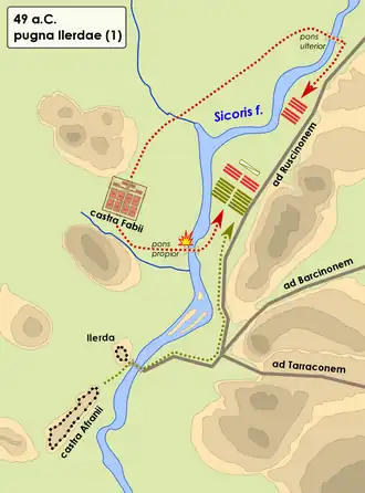 Fábio expulsou as guarnições de Afrânio dos passos dos Pireneus[21], enviou mensageiros para conseguir o apoio das tribos da região e realizou várias incursões em busca de provisões, enfrentando a cavalaria pompeiana. Depois, construiu duas pontes de madeira sobre o Rio Sicoris, a pons propior e a pons ulteriores[22]. Os pompeianos, por outro lado, controlavam uma ponte de pedra perto da cidade[18].