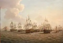 ![]() Batalha ao largo do Cabo de São Vicente, 16 de Janeiro de 1780 de Francis Holman, pintado 1780, mostra o Santo Domingo a explodir e o navio-almirante de Rodney, Sandwich em primeiro plano. | |||