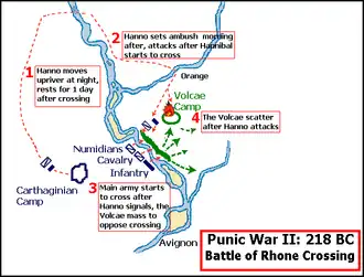 Aníbal colocou Hanão, filho da Bomílcar, no encargo de uma coluna formada por infantaria e cavalaria na terceira noite e enviou esta força rio acima, na escuridão da noite, para encontrar um outro local para a travessia. Guiado por locais, Hanão localizou um vau a cerca de 40 quilômetros ao norte do acampamento cartaginês, perto de uma "ilha",[12] e conseguiram atravessar sem serem detectados com a ajuda de balsas improvisadas. Alguns iberos cruzaram o rio utilizando peles de animais infladas como boias. Este destacamento descansou por um dia e depois marchou para o sul na noite seguinte (a segunda depois da travessia do exército principal) e chegou na retaguarda dos volcas ao amanhecer.