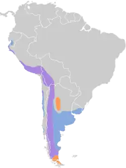 A ave se reproduz nos Andes, na Argentina, Bolívia, Chile e Peru. Migrantes não reprodutores atingem o Equador, Brasil e Uruguai e é considerada vagante nas ilhas Malvinas. Os seus habitats naturais são: matagal tropical ou subtropical seco, vegetação temperada, de alta altitude tropical ou subtropical.[4]