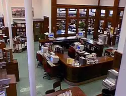 Localizada logo após o saguão, a mesa de circulação – não mais uma mesa de entrega – ocupava o centro do palco em Lawrenceville, ladeada por catracas que admitiam leitores às estantes abertas um de cada vez, sob o olhar atento do bibliotecário. Para evitar furtos, as estantes eram organizadas em um padrão radial. Em cada lado do saguão, havia uma sala de leitura geral e, pela primeira vez em uma biblioteca, uma sala para crianças... As salas de leitura eram separadas por paredes que se tornavam divisórias de vidro acima da cintura – para melhor supervisionar.[3]