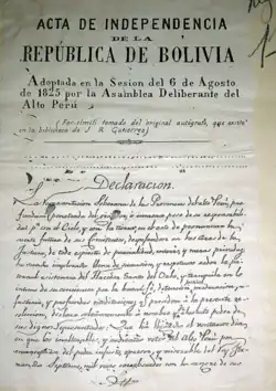 A independência da Bolívia foi oficialmente proclamada o 6 de agosto de 1825 num Congresso celebrado na cidade de Chuquisaca (atual Sucre).
