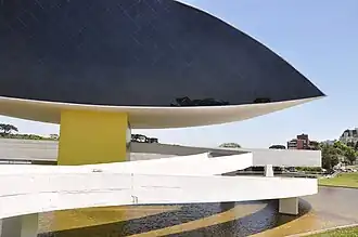 Vista da fachada do Museu Oscar Niemeyer, em Curitiba, ao longo da 14ª Bienal de Curitiba, realizada em 2019. -