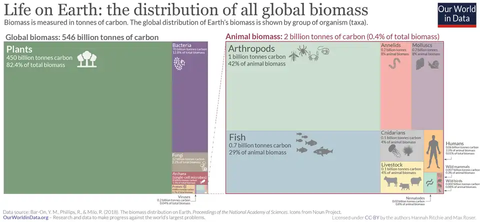 Os animais representam menos de 0,5% da biomassa total da Terra, com cerca de 2 bilhões de toneladas de C no total. A maior parte da biomassa animal é encontrada nos oceanos, onde os artrópodes, como os copépodes, são responsáveis por cerca de 1 bilhão de toneladas de C e os peixes por outros 0,7 bilhão de toneladas de C.[1] Aproximadamente metade da biomassa de peixes no mundo é mesopelágica, como o peixe-lanterna,[26] que passa a maior parte do dia em águas profundas e escuras.[27] Os mamíferos marinhos, como baleias e golfinhos, são responsáveis por cerca de 0,006 bilhão de toneladas de C.[28]