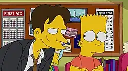 Bart (à direita) conhece sou novo professor, o Sr. Lassen (à esquerda), na imagem promocional do episódio. | |||||