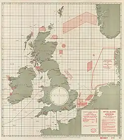 Mapa oficial da Marinha Real mostrando posições aproximadas de campos minados navais ao redor das Ilhas Britânicas, 19 de agosto de 1918.