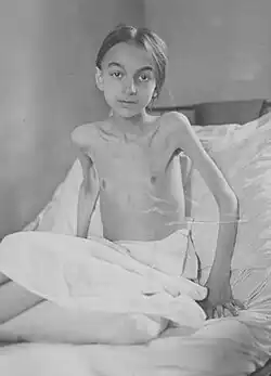 Imagem de imprensa de uma criança alemã desnutrida com tuberculose. Foto marcada entre 1918 e 1920.