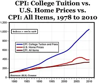 Devido à GI Bill e ao crescimento populacional após a Segunda Guerra Mundial, a procura pelo ensino superior cresceu significativamente durante a segunda metade do século XX, tornando-se um dos principais setores de crescimento da economia americana.[45][46] Historicamente, as escolas secundárias separavam os alunos de acordo com a carreira, mas isto mudou no final da década de 1980 e no início da década de 1990, quando a missão das escolas secundárias passou a ser preparar os alunos para a faculdade.[47] Em 1987, o Secretário da Educação dos EUA, William Bennett, sugeriu que a disponibilidade de empréstimos estava a alimentar um aumento dos preços das propinas e uma bolha educacional.[48] A "hipótese de Bennett" afirmava que empréstimos prontamente disponíveis permitem que as escolas aumentem as mensalidades sem levar em conta a elasticidade da procura. Além disso, as classificações das faculdades foram parcialmente impulsionadas pelos níveis de despesa,[49] e o aumento das propinas também foi correlacionado com o aumento das perceções públicas de prestígio.[50] Entre as décadas de 1980 e 2010, a procura pelo ensino superior aumentou, especialmente após a Grande Recessão de 2007-2009, quando os americanos regressaram à escola para se adaptarem à nova economia.[51][46]