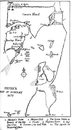 - ↑ Atualmente o topónimo Karanja aparece nos mapas na península situada a sul-sudeste de Colaba.