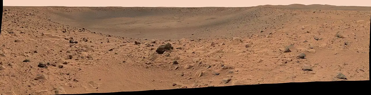 - ↑ a b c Squyres,; Arvidson, R; Bell Jf, 3rd; Cabrol, NA; Carr, MH; Christensen, P; Crumpler, L; Des Marais, DJ; Ehlmann, BL; et al. (2004). «Surficial Deposits at Gusev Crater Along Spirit Rover Traverses». Science. 305 (5685): 807–810. PMID 15297659. doi:10.1126/science.1099849