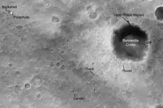 ![]() Vista superior da Mars Global Surveyor em 20 de dezembro de 2004, na qual aparece o veículo Spirit, seu aterrissador, paraquedas, escudo térmico, escudo traseiro e a rota dos veículos (rovers) | |