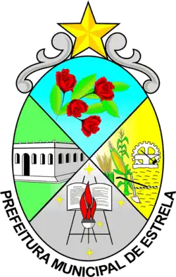 - Sobre o escudo, o timbro, composto de uma estrela de ouro, encasteada em dois florões de prata, arremata o brasão de armas do município de Estrela.
